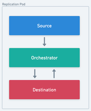 The source, destination and orchestrator all run in a single podThe sidecar processes the output of the connector and forwards it back to the core platform